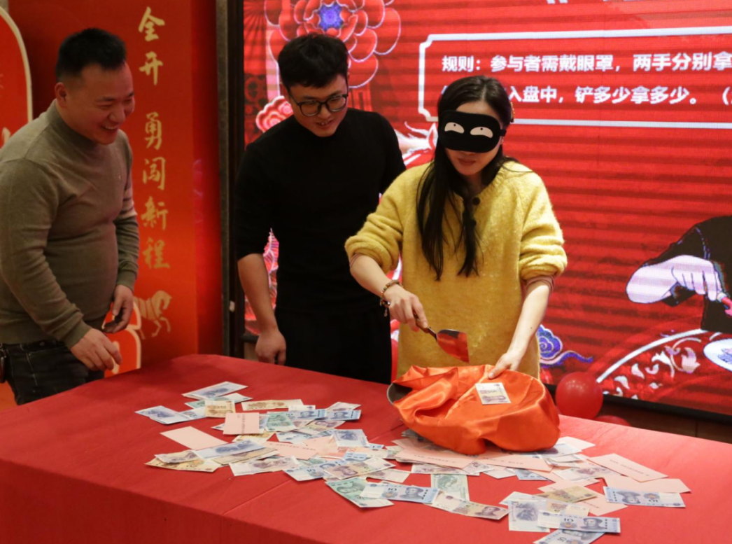 《蒙眼铲钞票》:戴眼罩铲现金,铲多少拿多少,刺激又欢乐,还有惊喜奖,与董事长先生单独合影。