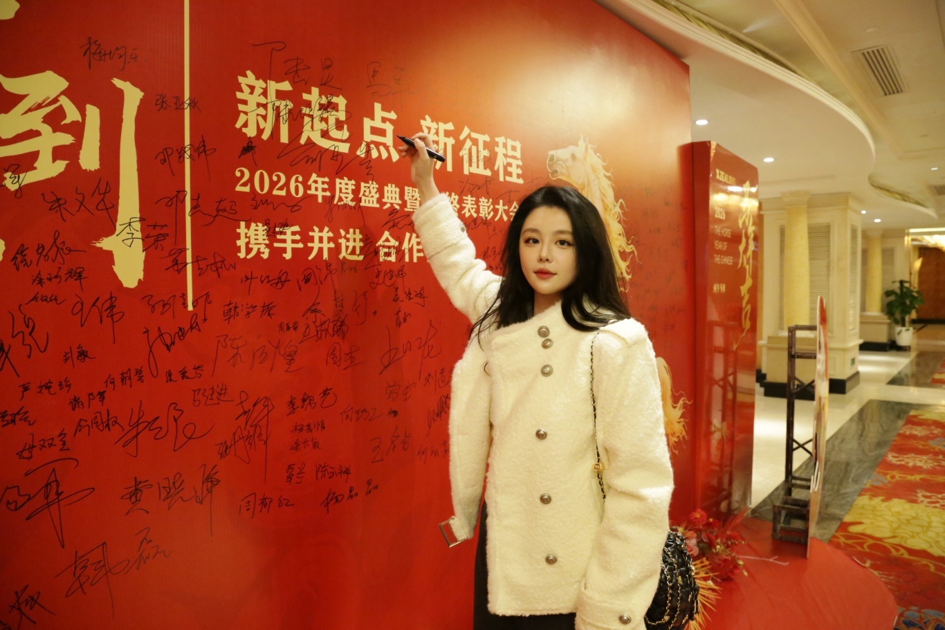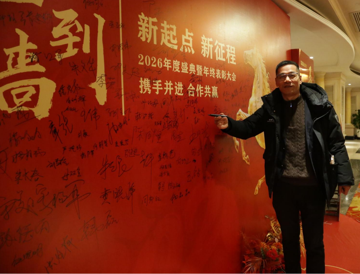 年会现场布置温馨,签到处为全体员工准备了沉甸甸的伴手礼,并且在入口处特别设置的签名墙成为第一道亮丽风景线。董事长陆炅先生、总经理石建华先生、供应链中心俞亚芳女士、泰索科技营销副总陆怡臻女士都在签名墙上留下新年美好展望;员工们也纷纷在签名墙上留下自己的名字与新年祝福,用笔墨记录这一美好时刻,拍照打卡留念,仪式感满满。一笔一划间,凝聚着泰索人对企业的深厚情感与对未来的美好期许。